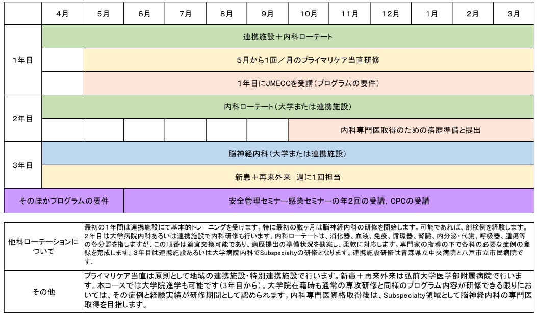 プログラムの特徴 | 最初の1年間は弘前大学医学部附属病院にて基本的トレーニングを受けます。特に最初の数ヶ月は担当指導医の下で脳神経内科の研修を開始します。可能であれば、剖検例を経験します。2年目は大学病院内科あるいは地域の連携施設で内科研修も行います。脳神経外科や脳卒中急性期病院での研修も行います。*1,2年目のこの順番は適宜交換可能であり、病歴提出の準備状況を勘案し、柔軟に対応します。専門家の指導の下で各科の必要な症例の登録を完成します。3年目は連携施設あるいは大学病院内科でSubspecialtyの研修となります。 | ||||||||
