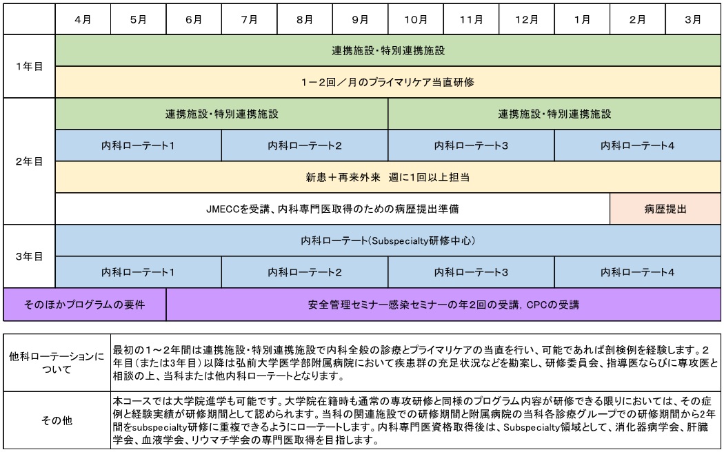 プログラムの特徴 | 最初の1年間は弘前大学医学部附属病院にて基本的トレーニングを受けます。担当指導医の下で研修を開始します。可能であれば、剖検例を経験します。2、3年目は弘前大学医学部附属病院あるいは地域の連携施設・特別連携施設で内科研修を行い、病歴提出の準備状況を勘案し、柔軟に対応します。2、3年目は連携施設あるいは弘前大学医学部附属病院でSubspecialty研修も可能です。プライマリケア当直は地域の連携施設・特別連携施設又は弘前大学医学部附属病院で行います。新患+再来外来は弘前大学医学部附属病院で行います。本コースでは大学院進学も可能です。大学院在籍時も通常の専攻研修と同様のプログラム内容が研修できる限りにおいては、その症例と経験実績が研修期間として認められます。Subspecialty領域として、糖尿病、内分泌代謝科の専門医取得を目指します。 | ||||||||