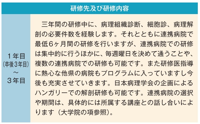 プログラムの特徴 | 近年医療における病理の役割はますます重要になってきました。厚生労働省の施策においても病院に病理医が常勤することが医療の質にとって重要であるとしています。しかし全国的に病理医は不足しています。これは病理医の仕事が単に組織診断に留まっているという認識が強いからかもしれません。そうではありません。病理は殆どの臨床科と関係が深く、個人の能力を上げることが全体の医療に貢献することに繋がるという大きな魅力があります。本プログラムでは単に高い診断能力を養うだけではなく、治療に役立つ組織情報の提供、病態の解析や未知の疾患の探究、そして病理医の立場から医療全体のマネジメントができ、今後の日本の医療に真に役立つ病理医の育成を目指します。 | ||||||